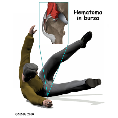 A can cause bleeding into the bursa, forming a hematoma. The bleeding is not serious, but the bursa may react to the blood by becoming inflamed. The inflammation causes the bursa to become thickened over time. This thickening, constant irritation, and inflammation may result in the condition becoming chronic, or long lasting.