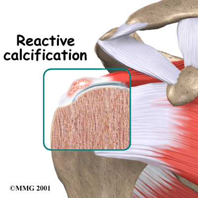 Reactive calcification is different. Why it occurs is not clear. It doesn't seem to be related to degeneration, though it is more likely to cause shoulder pain than degenerative calcification. Doctors think of reactive calcification in three stages. In the pre-calcific stage, the tendon changes in ways that make calcium deposits more likely to form. In the calcific stage, calcium crystals are deposited in the tendons. Then they begin to disappear. The body simply reabsorbs the calcium deposits. Ironically, it is during this stage that pain is most likely to occur. In the post-calcific stage, the body heals the tendon, and the tendon is remodeled with new tissue.
