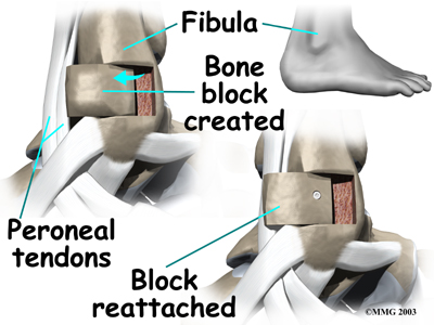 The surgeon slides the small block of bone backward, out of its original spot. The bone may be rotated slightly to create a solid barrier that will help keep the tendons from sliding around the lower edge of the fibula. A screw is inserted through the small block of bone into the fibula. The screw keeps the bony block in its until it heals.